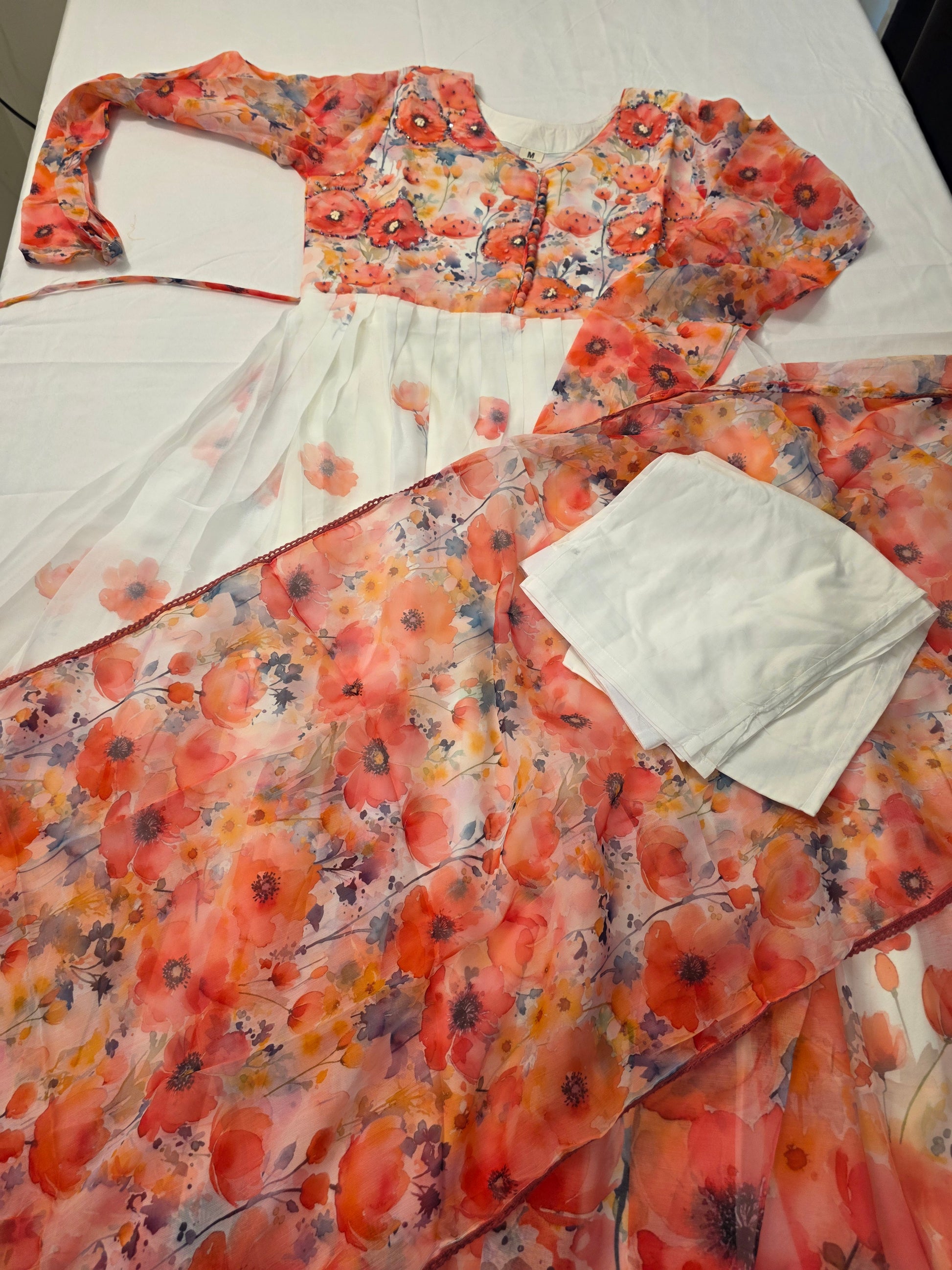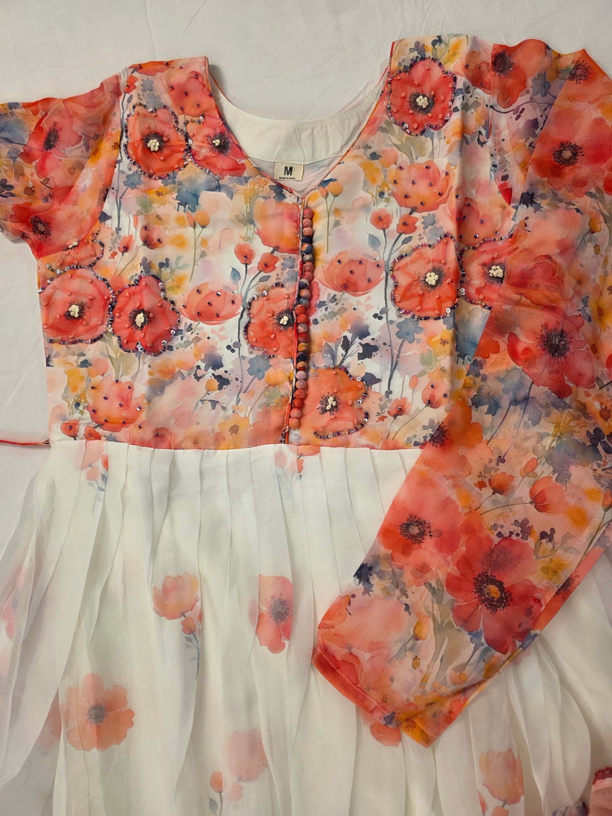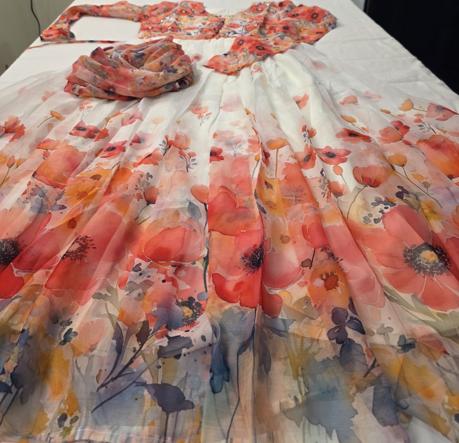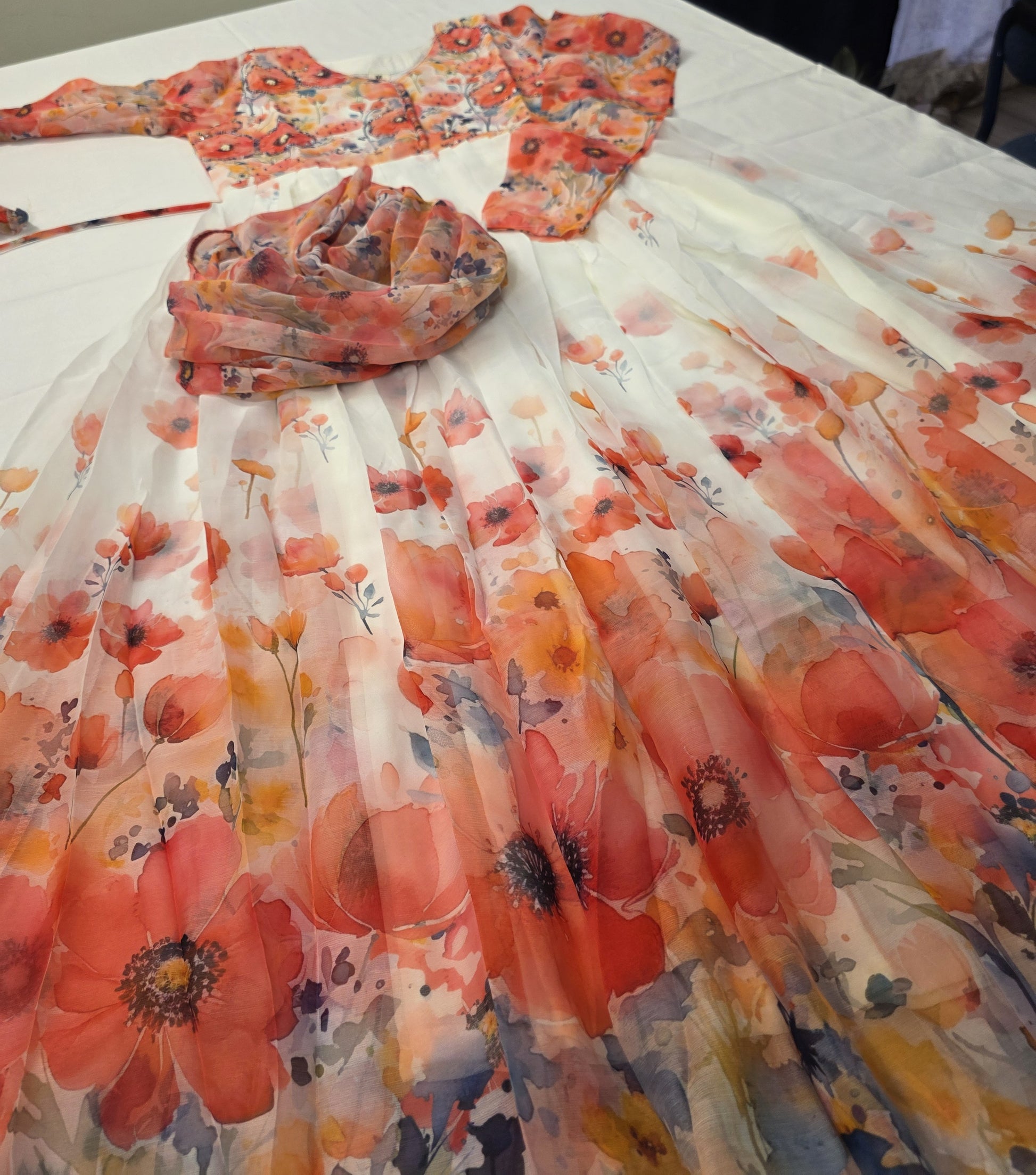 Fresh white suit with delicate floral designs, perfect for daytime events, casual gatherings, or festive occasions, radiating elegance and charm.