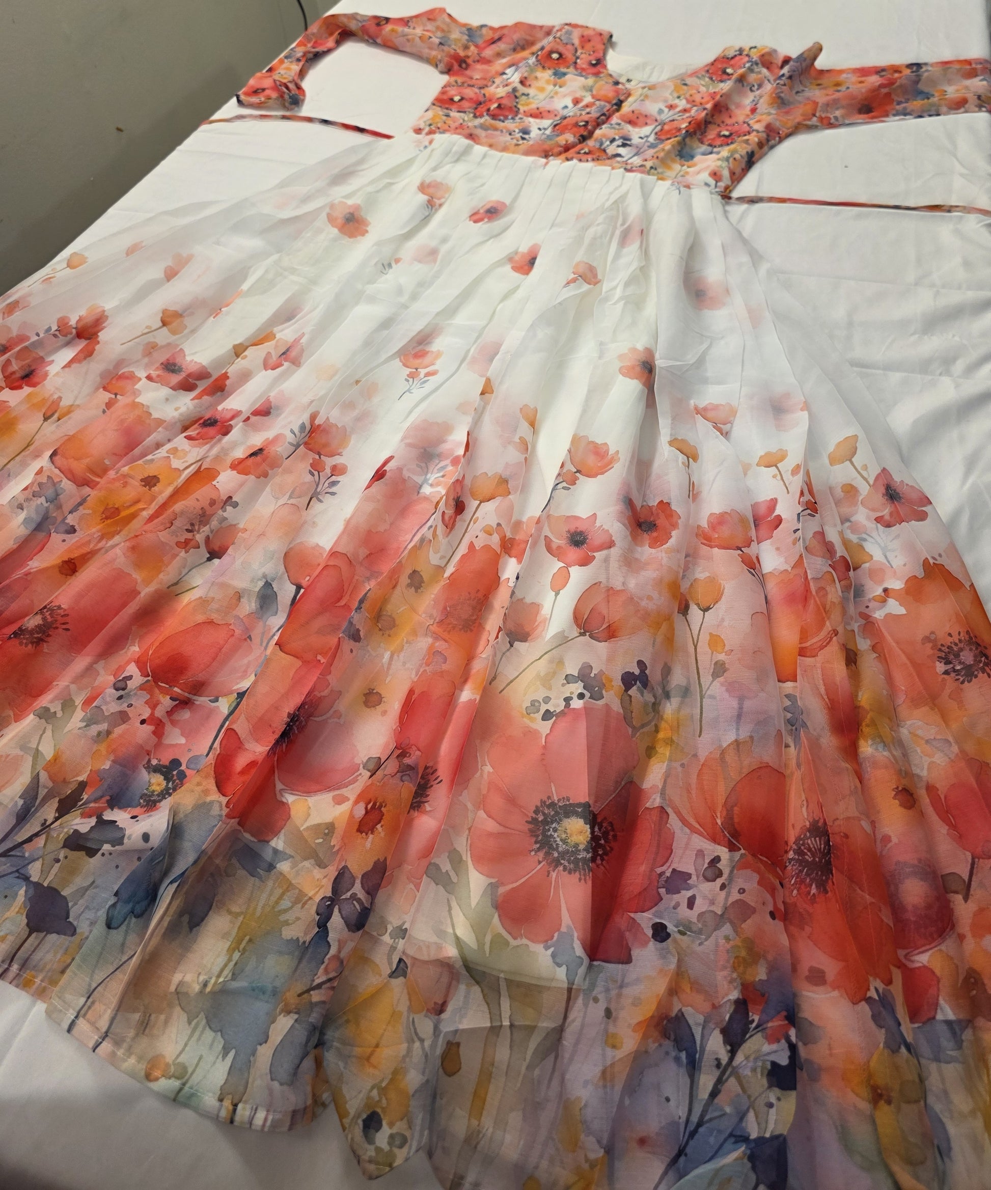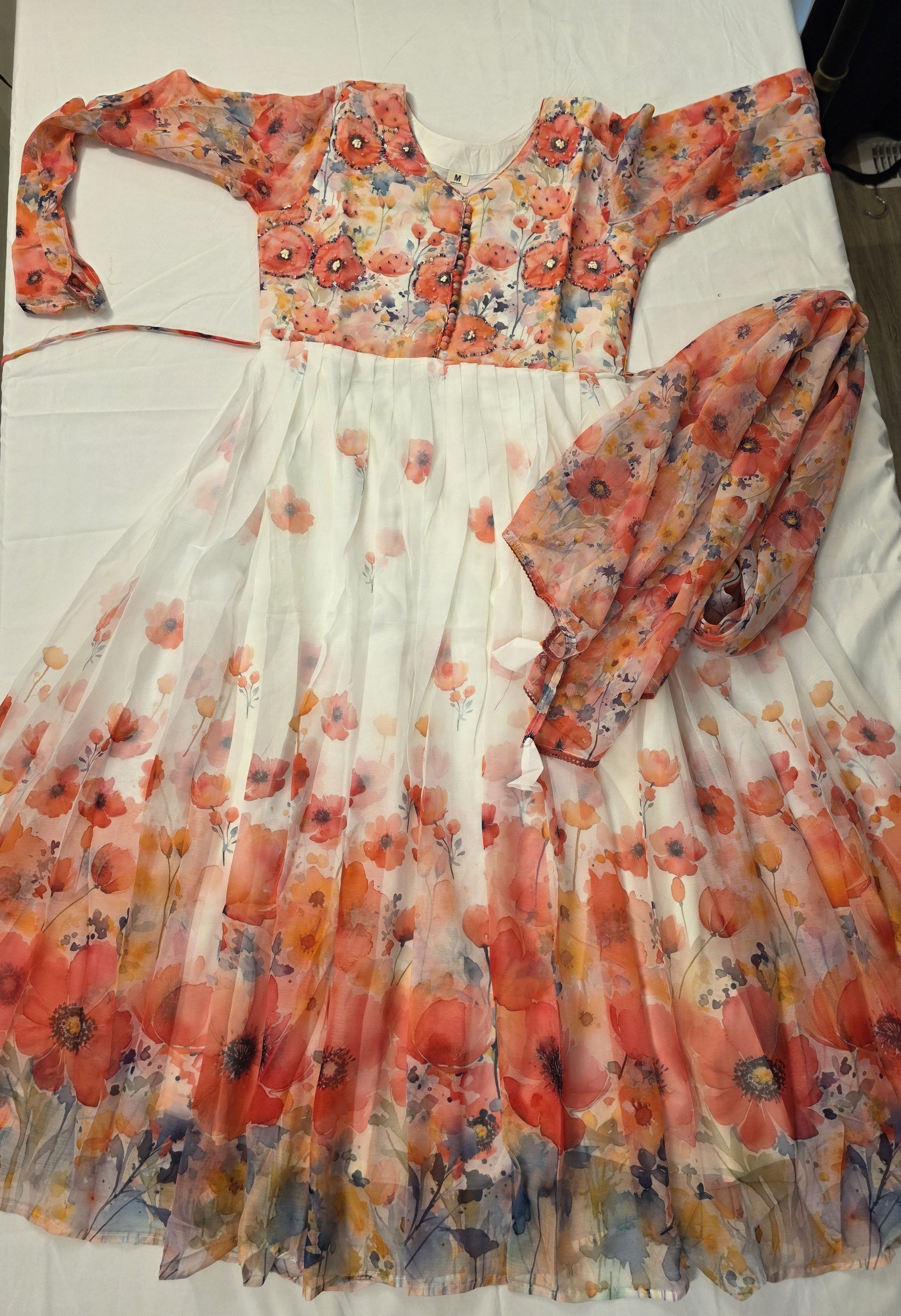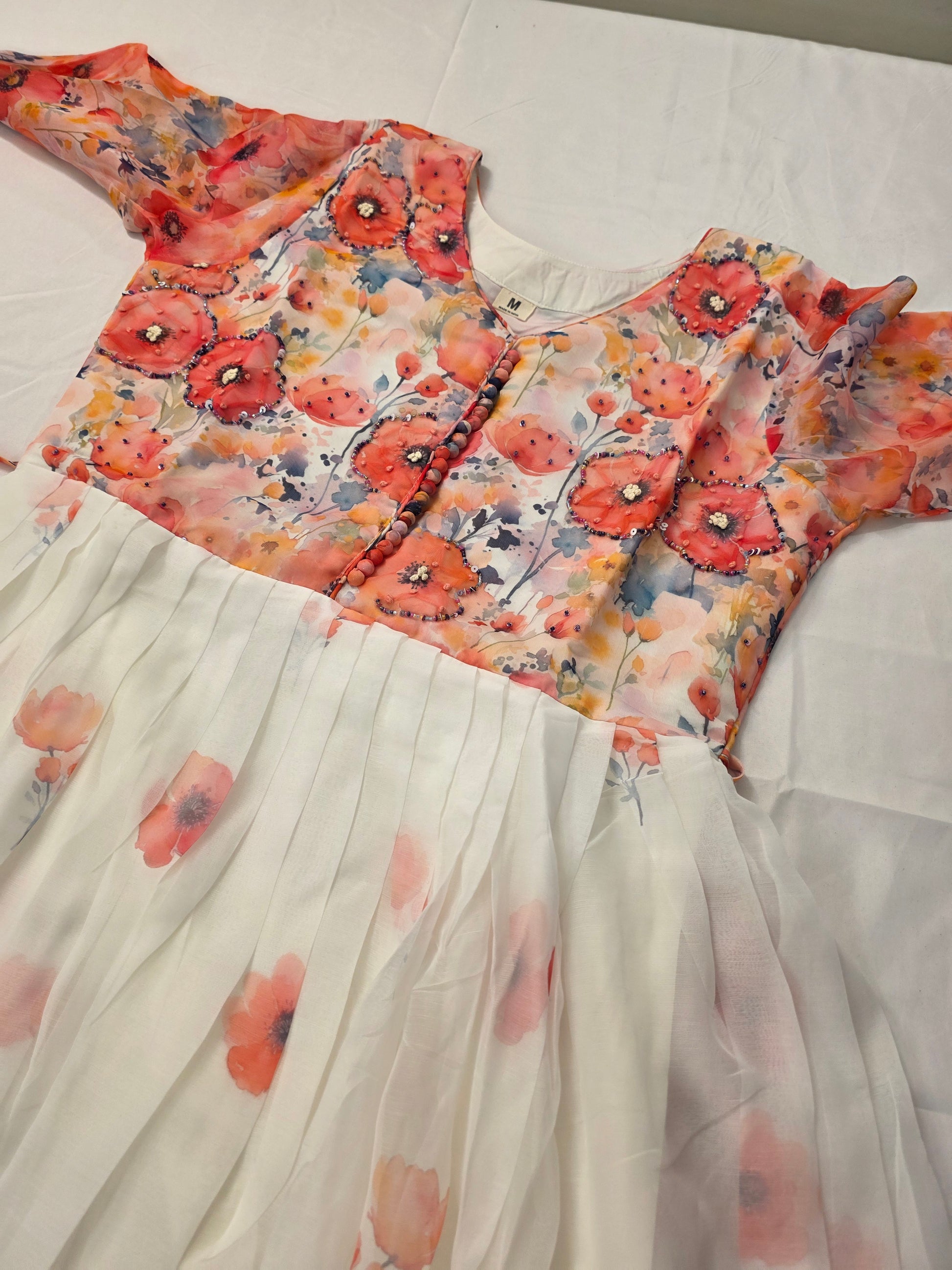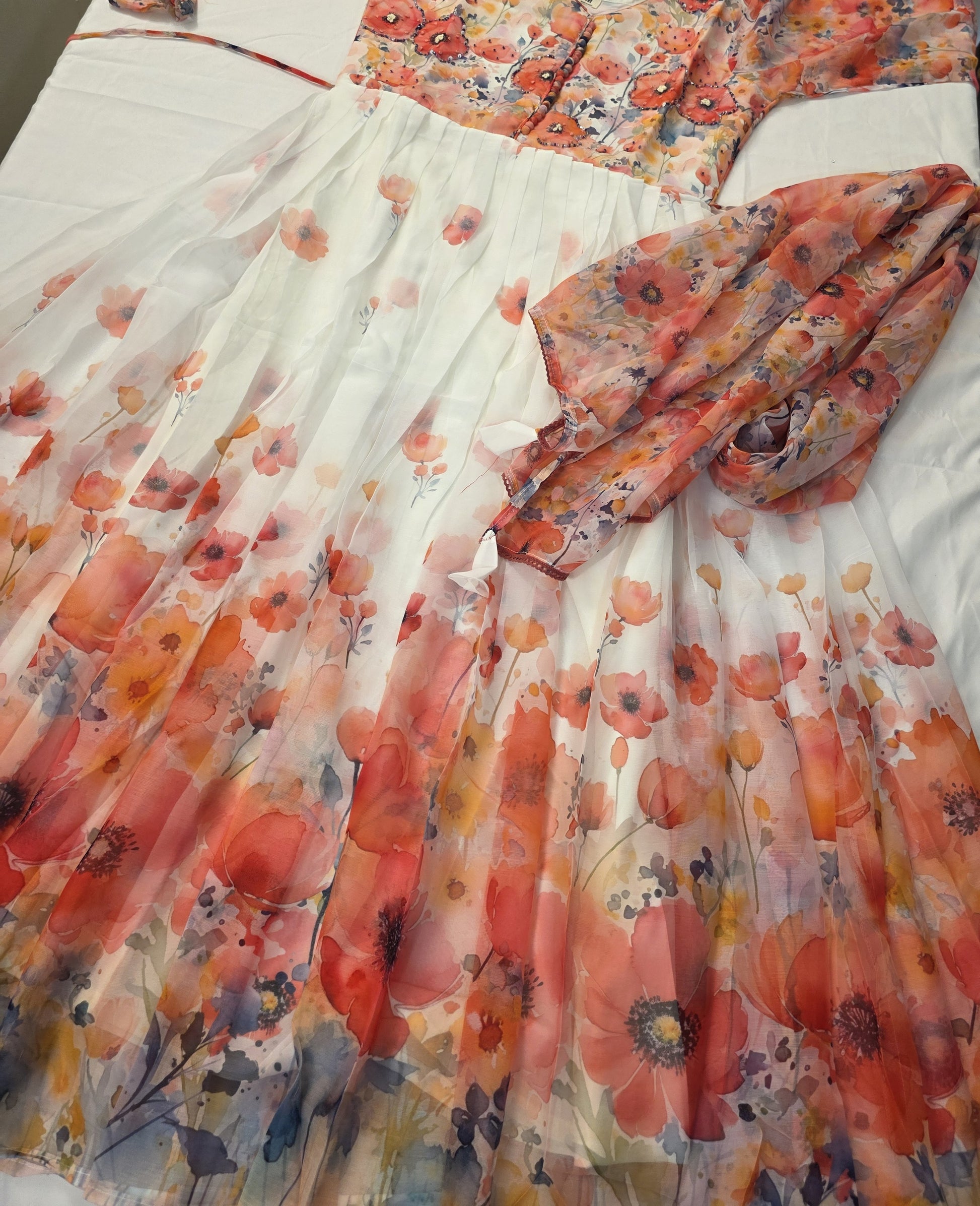 Fresh white suit with delicate floral designs, perfect for daytime events, casual gatherings, or festive occasions, radiating elegance and charm.