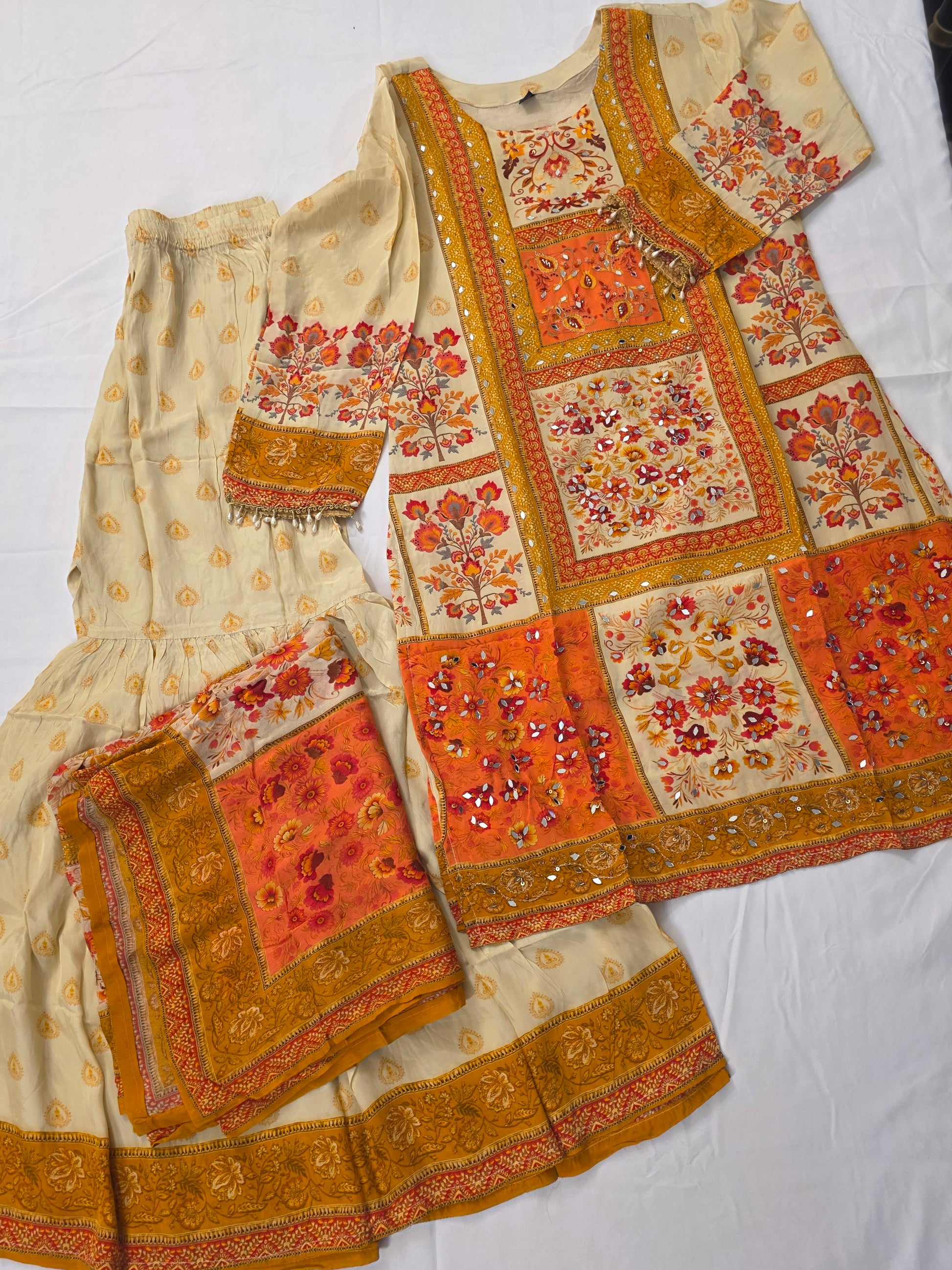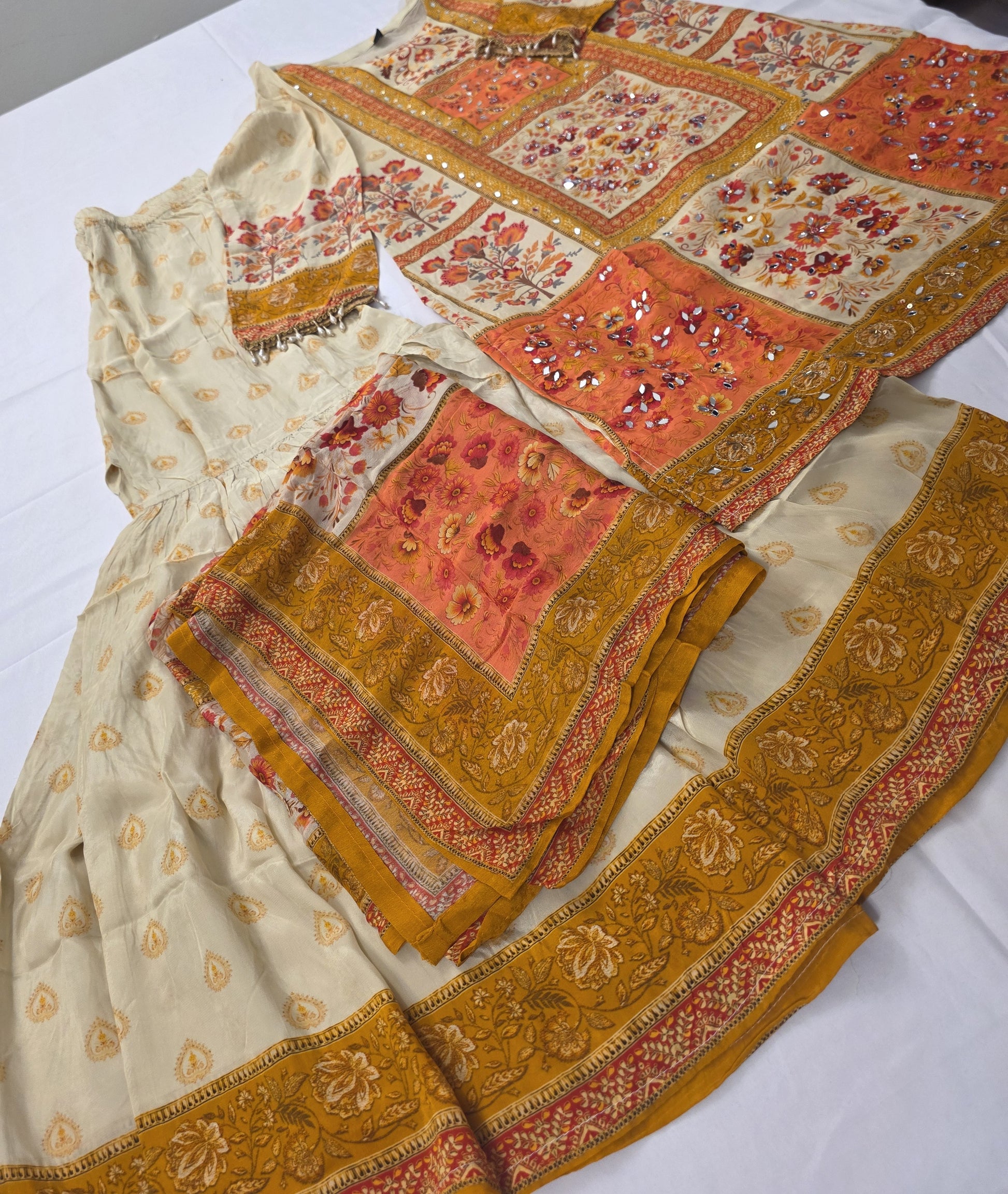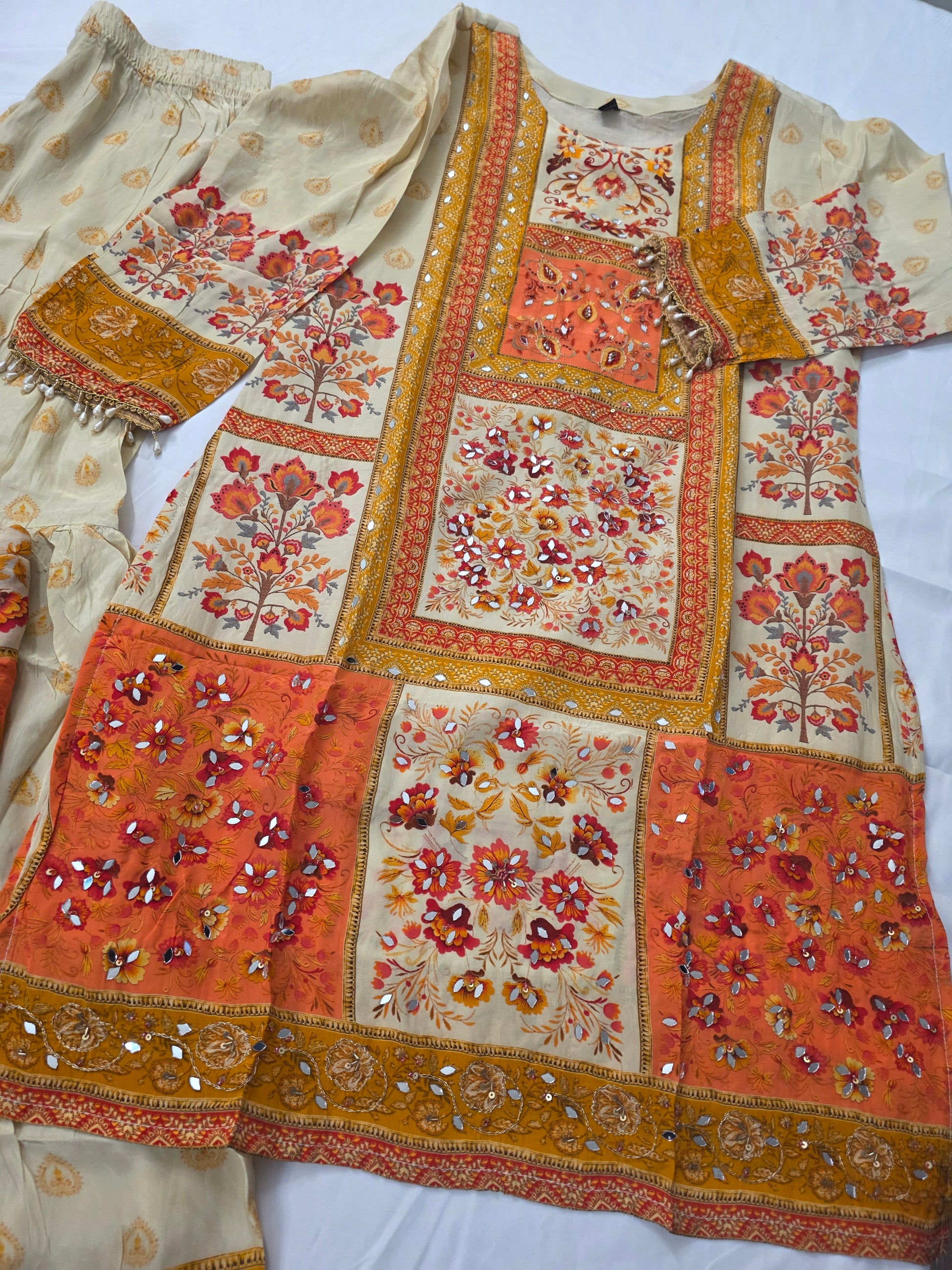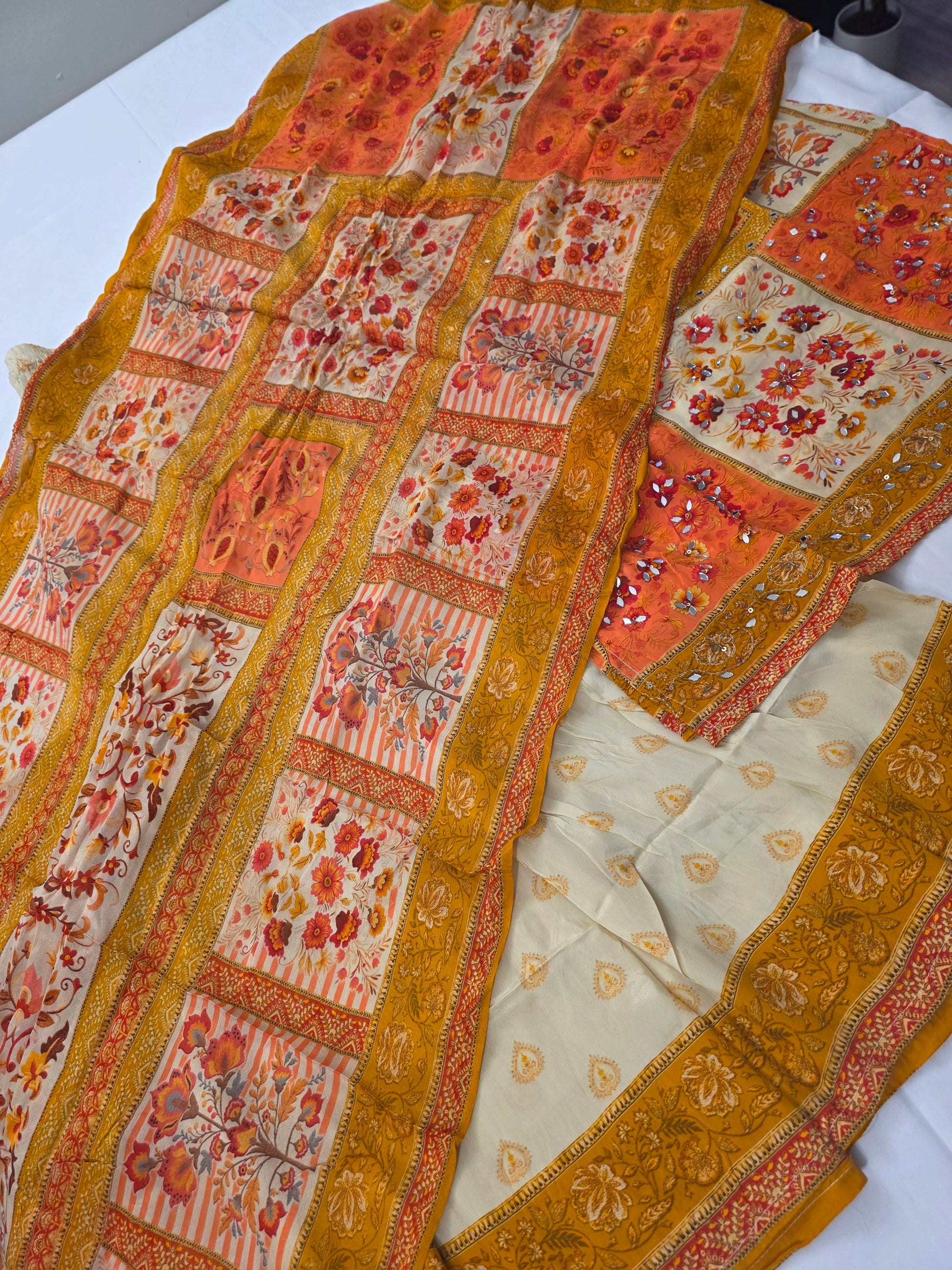 Cream suit with soft orange and yellow hues, adorned with delicate small floral designs, perfect for festive occasions, casual celebrations, or traditional gatherings.