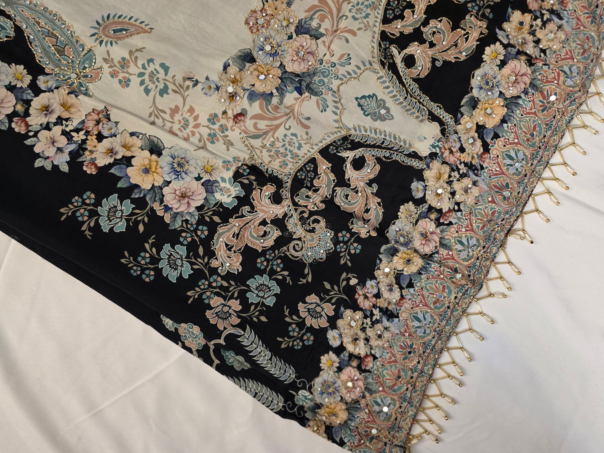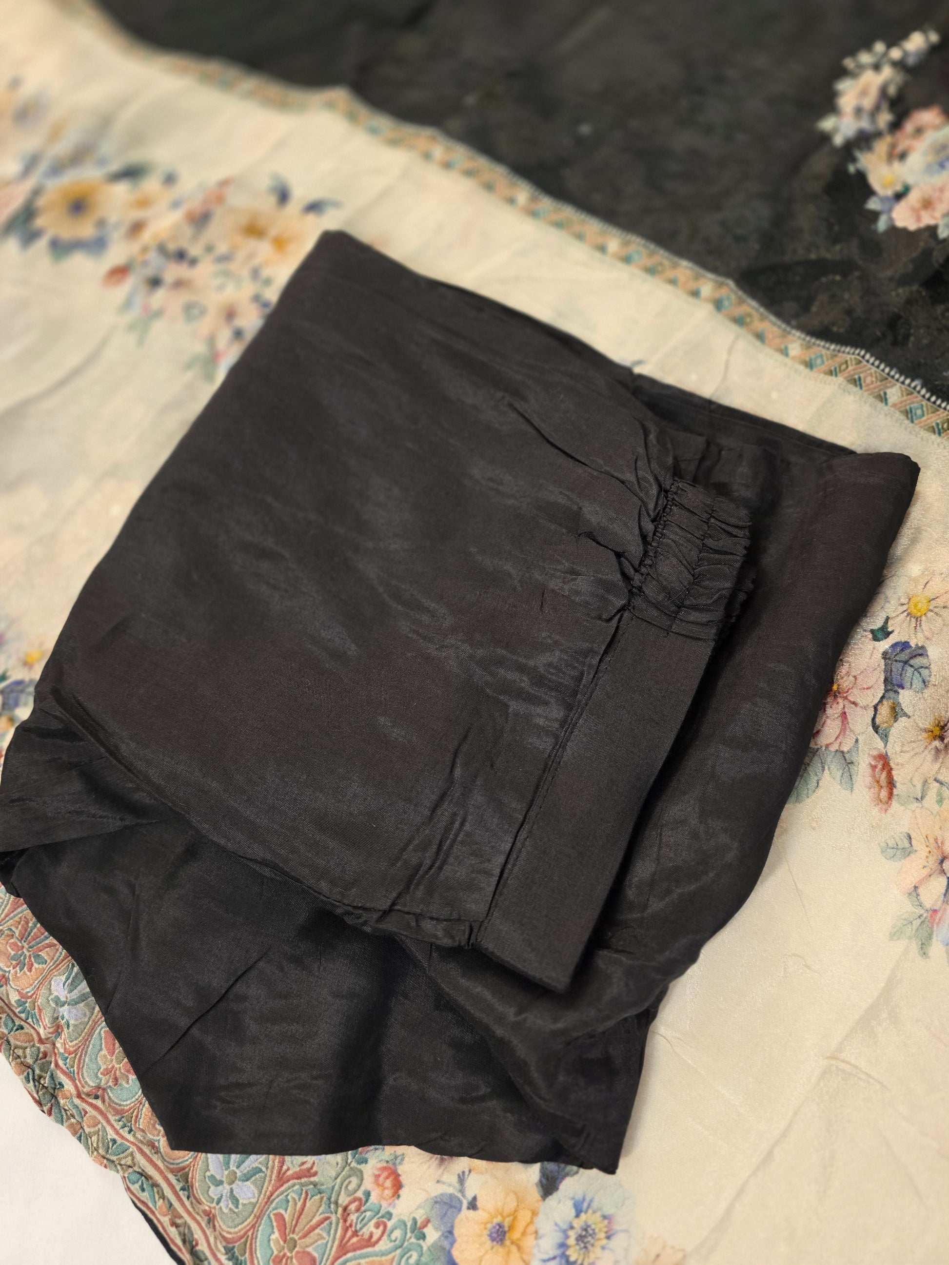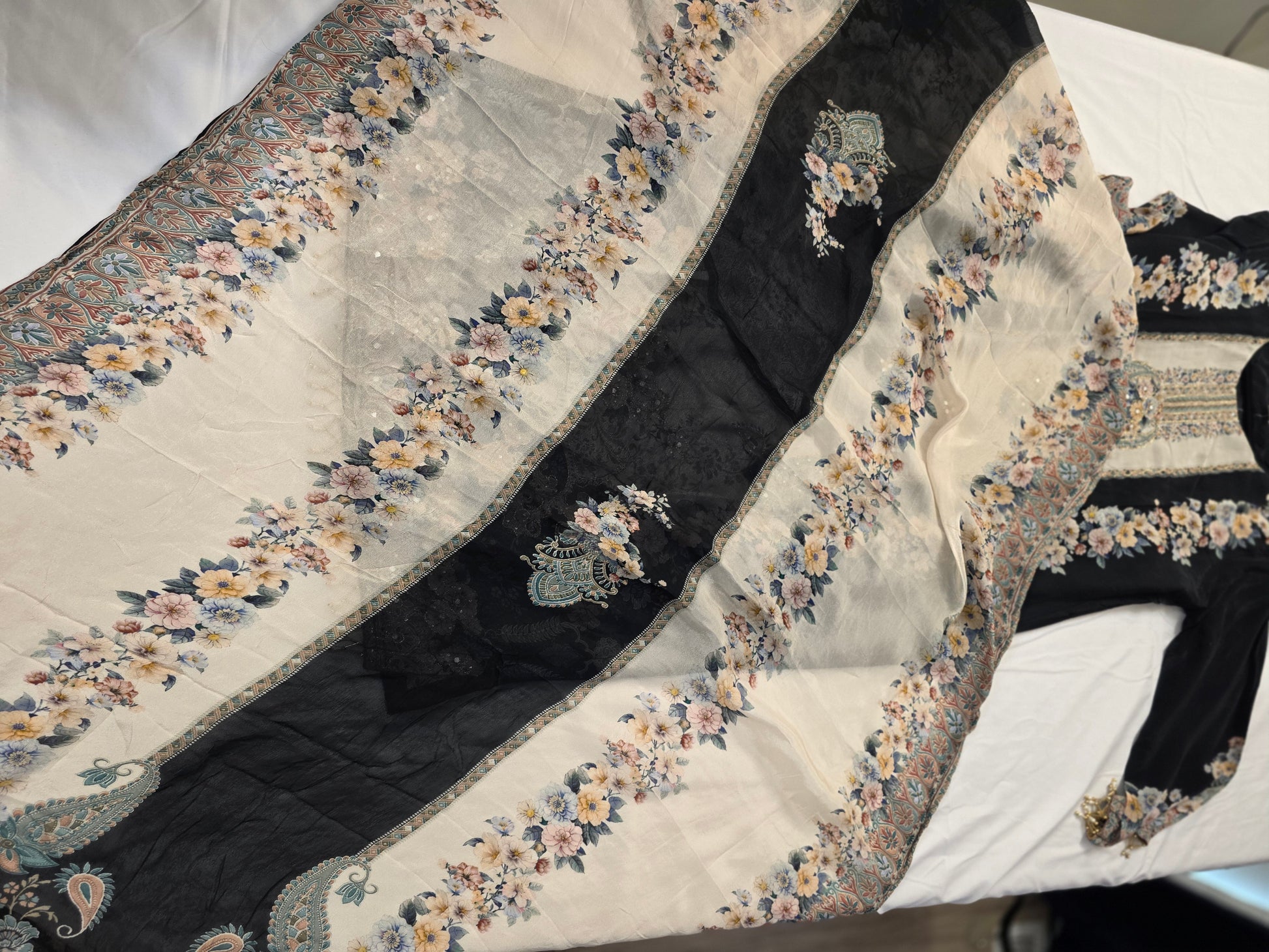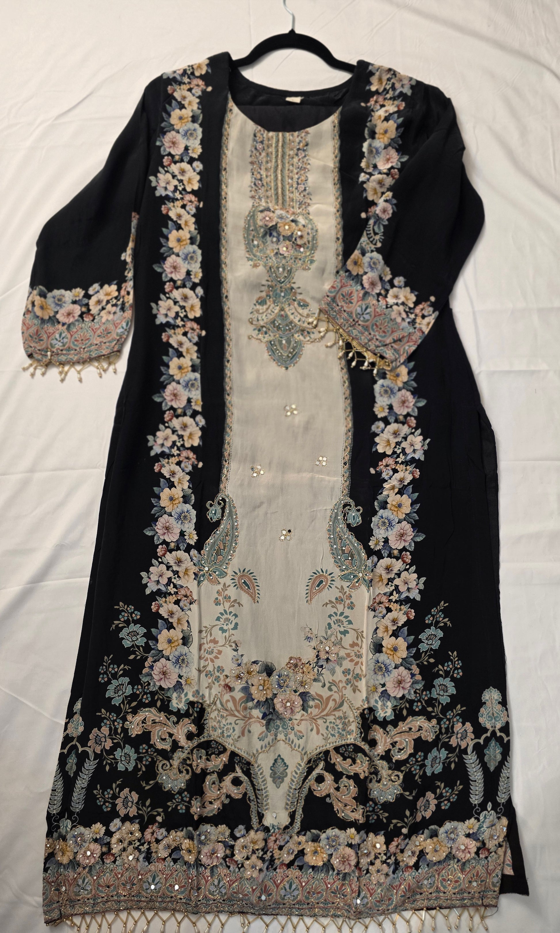 A stunning black-and-white designer suit featuring intricate desi embroidery and modern cuts. Perfect for weddings, festivities, or special occasions, it radiates elegance, sophistication, and cultural charm.