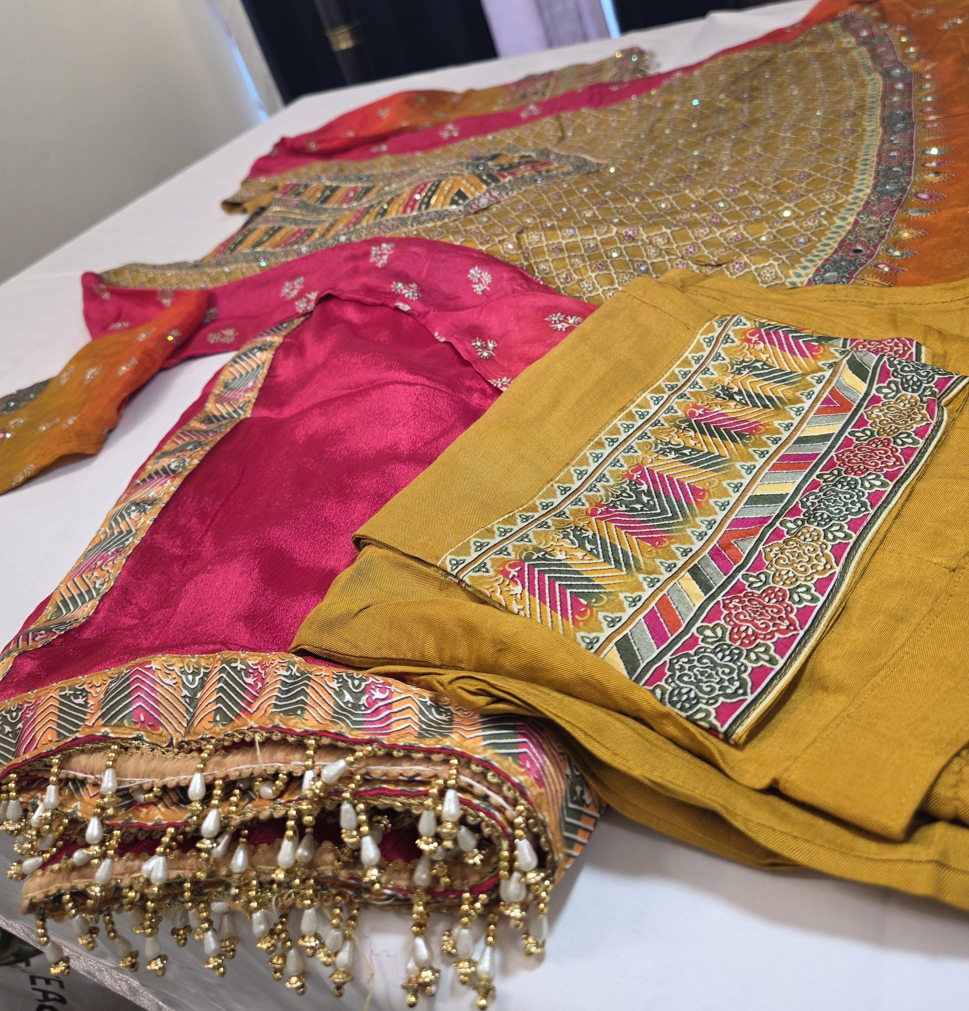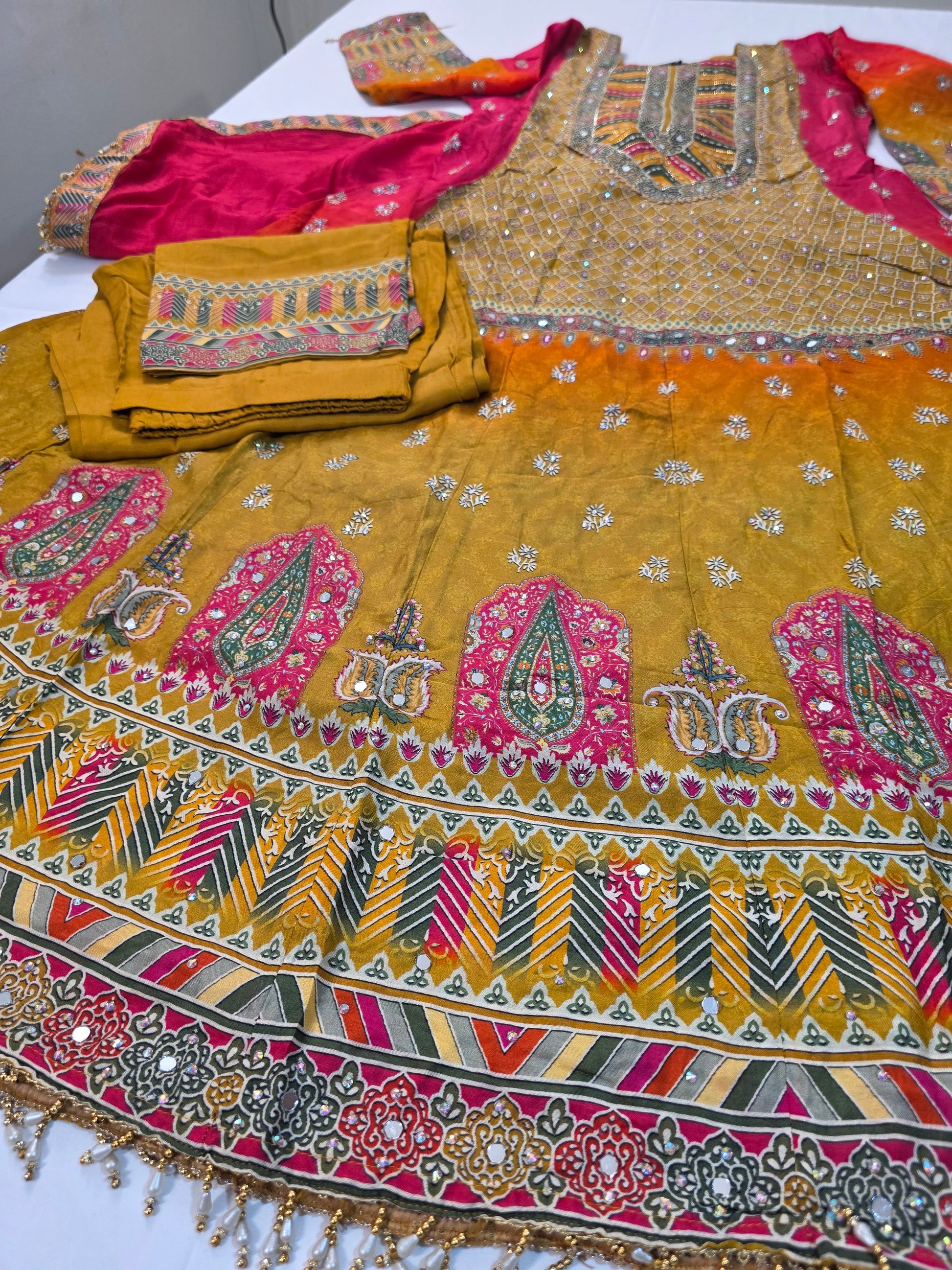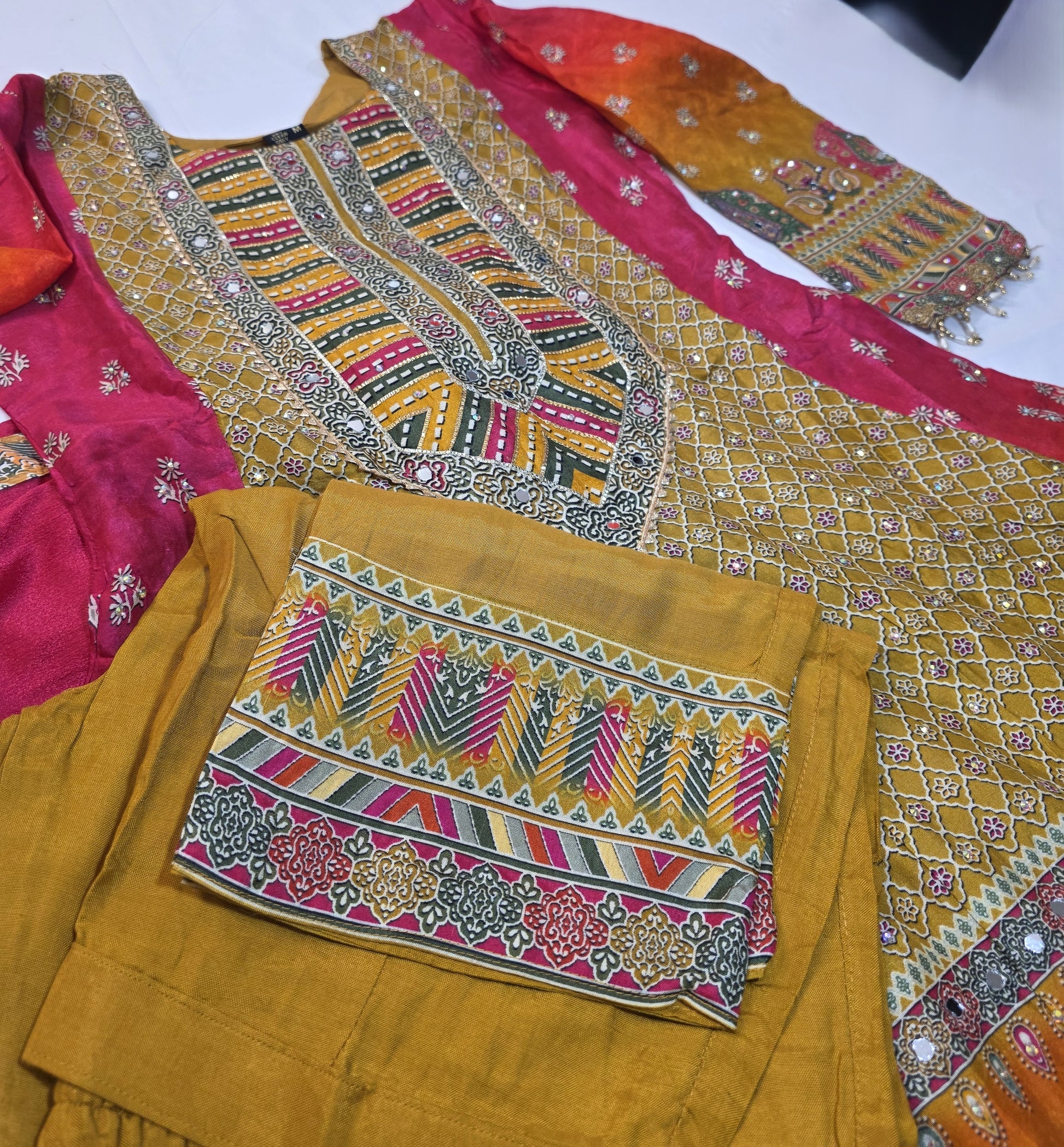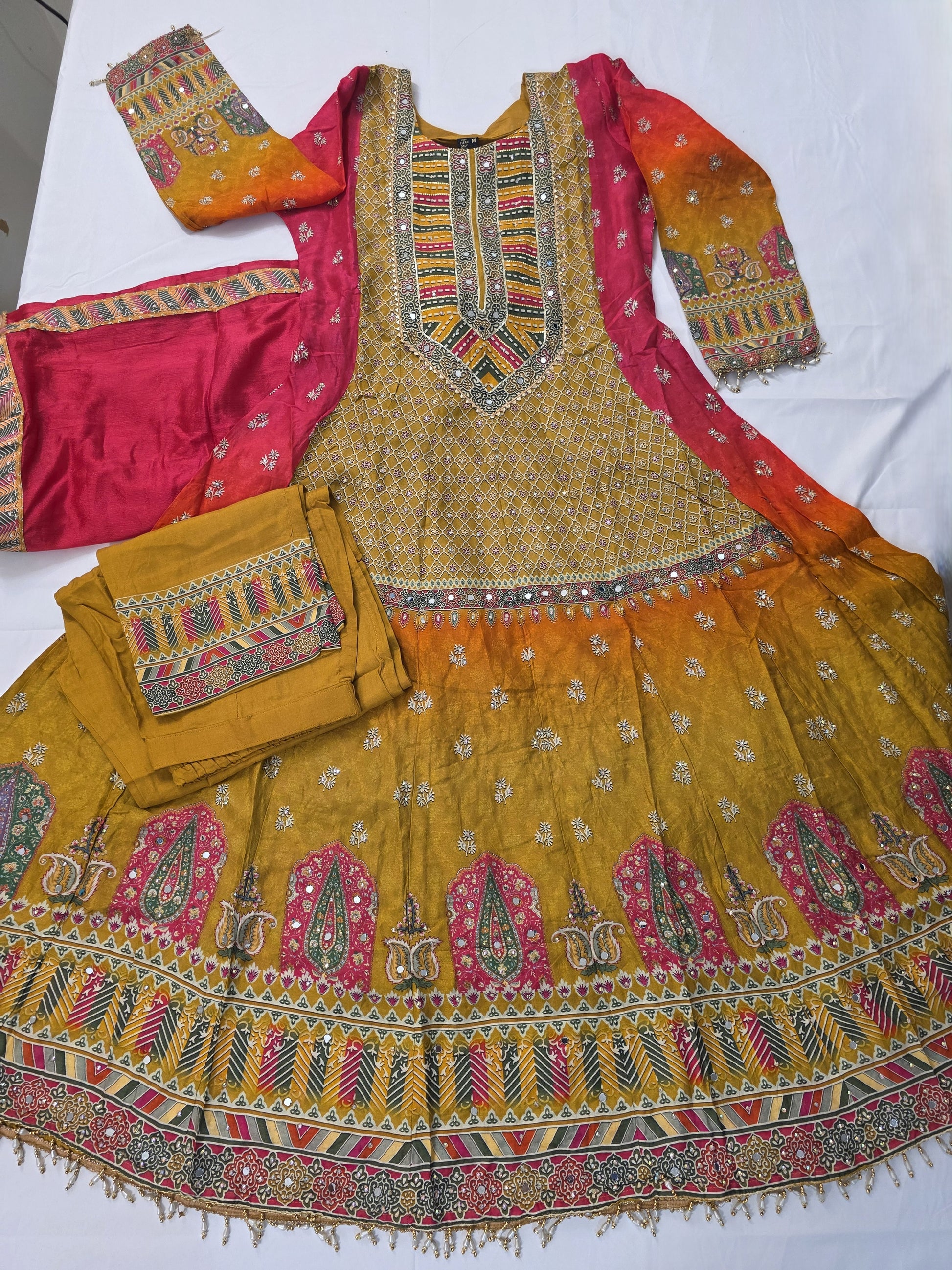 A vibrant multicolor suit in shades of red, yellow, and orange with beautiful design, perfect for festive occasions, parties, or traditional celebrations.